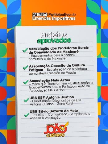 Resultado do 1º Edital Participativo de Emendas Impositivas neste ano de 2025. Associações e Unidades Básicas de Saúde foram aprovadas e vão receber recursos para melhorar suas estruturas. Alguns projetos apresentados e não selecionados na primeira divulgação, também poderão ser aproveitados, com diligências para adequação ao edital. “Mais participação, transparência e resultados pra Currais Novos”, destacou o vereador João Gustavo.
